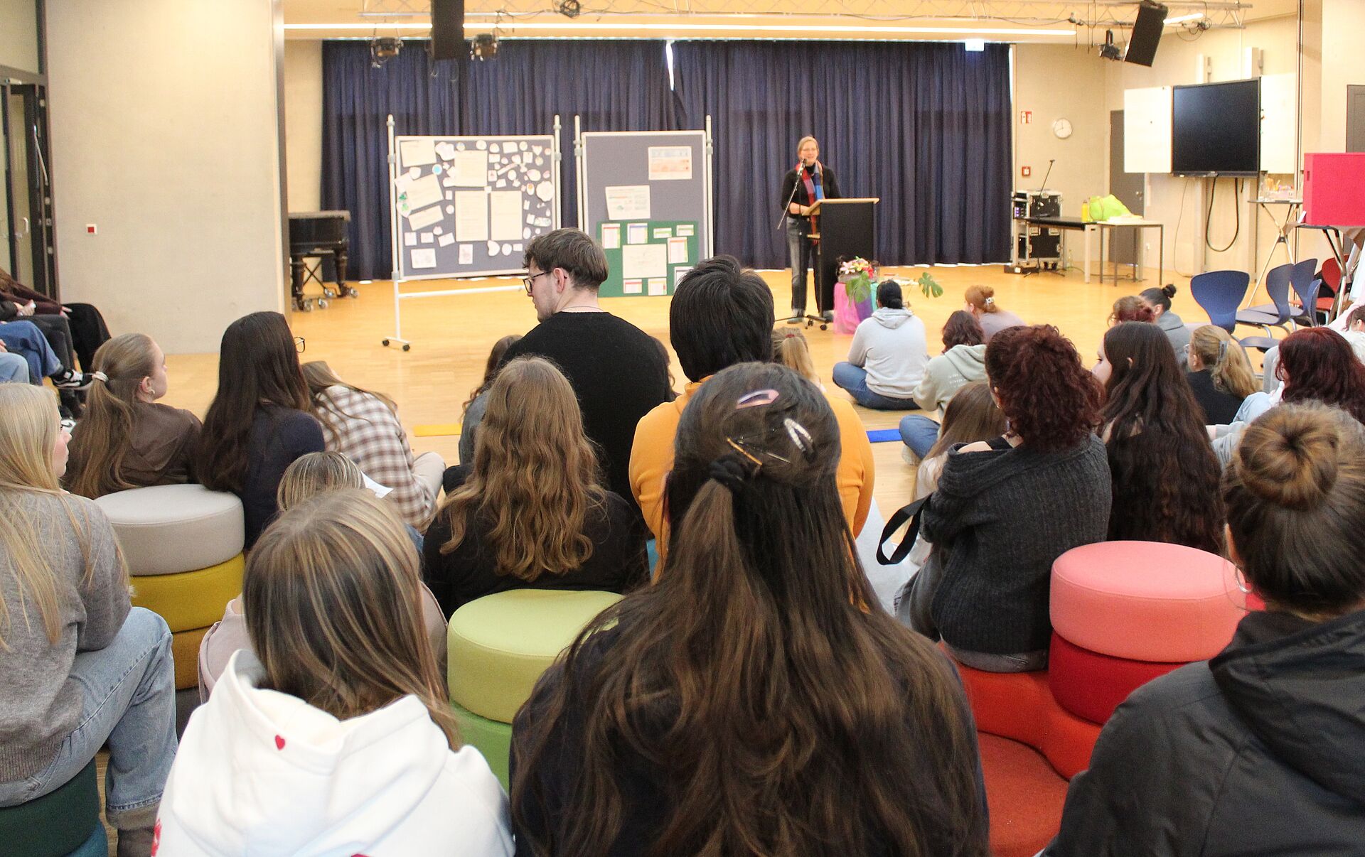 Im Anschluss setzten sich die Studierenden an interaktiven Stationen mit dem Schwerpunktthema „Konsum“ auseinander. Themen wie Fleischkonsum, Fast Fashion, Müllvermeidung, und nachhaltige Kosmetik sowie Fragen zu Alkohol- und Zigarettenkonsum verdeutlichten die globalen Auswirkungen individueller Alltagsentscheidungen. Mehrere Stationen wurden von Studierenden selbst konzipiert und gestaltet. Externe Partner wie Psychologists for Future und der Weltladen Fürth brachten zusätzliche Perspektiven ein und erläuterten die Bedeutung der Klimaresilienz, beziehungsweise die Zusammenhänge zwischen Konsum, globalen Lieferketten und sozialer Gerechtigkeit.